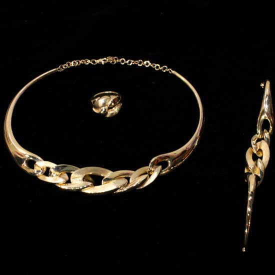 Presented is a beautiful set of jewelry boasting a contemporary design. This jewelry set includes a bangle, a bracelet and a ring, all set in 18K gold. The exquisite chain design looks simple fabulous in ladies’ eyes.