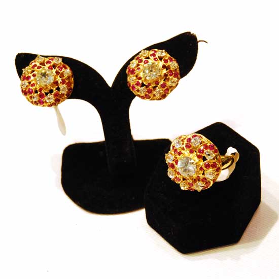 Presented here is an exquisite set of jewelry made with rubies, diamonds and 18K gold. The set offers a ring and a pair of earrings. The intriguing design is interpreted through the careful arrangement of the sparkling diamonds and rubies.