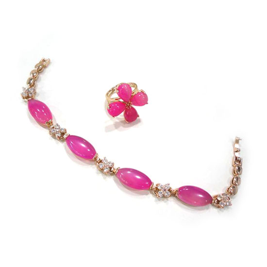 This beautiful ladies' jewelry set is completed by a bracelet and a ring with matching designs. Each piece of jewelry is adorned with romantic, lustrous stones in pink for alluring elegance. This ladies' jewelry set dresses up most outfits with sophistication.