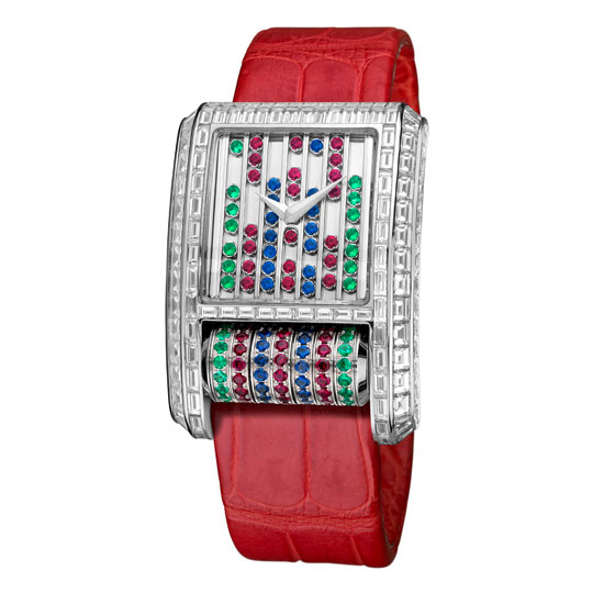 - Dial: 14 emeralds, 0.17ct/20 rubies, 0.39ct/14 blue sapphires, 0.27ct.