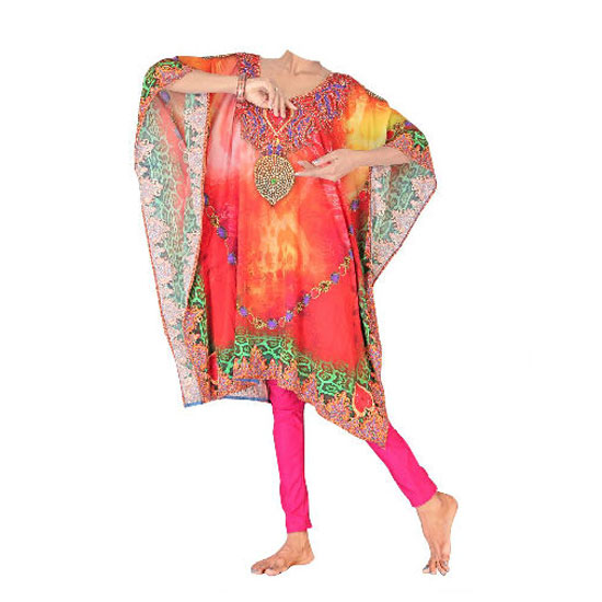 Displayed is a ladies' kaftan coming with an orange and green finish. The intricate pattern is printed by digital machine. It is a perfect ethnic garment to bring out your unique personality.