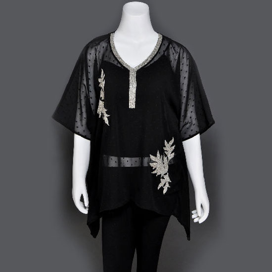 This ladies’ kaftan comes with loose sleeves and an irregular hemline. The sheer black fabric is nicely embellished with shimmering patterns. This beautiful garment looks particularly nice with slim-fitting pants.