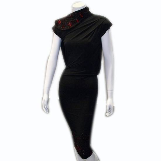 The party dress features a fitted-cut design that showcases ladies' silhouette. The asymmetric collar and dress bottom are highlighted by stones and beading for a beautiful decorative touch. This stunning party dress is the perfect addition to ladies' grand wardrobe.