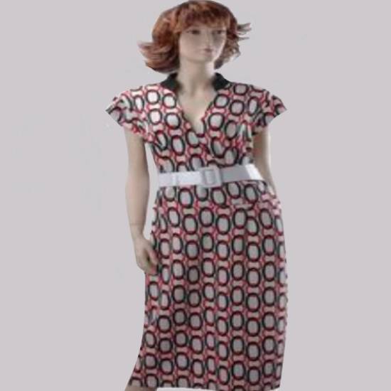 The elegant cap-sleeve knitted dress comes with a unique tunic collar and deep V-neckline. It features sleek chain prints in white and red running vertically along the bodice. An appealing waist belt finishes the dress with vogue and portrays a slim-fit silhouette to enhance your body shape.