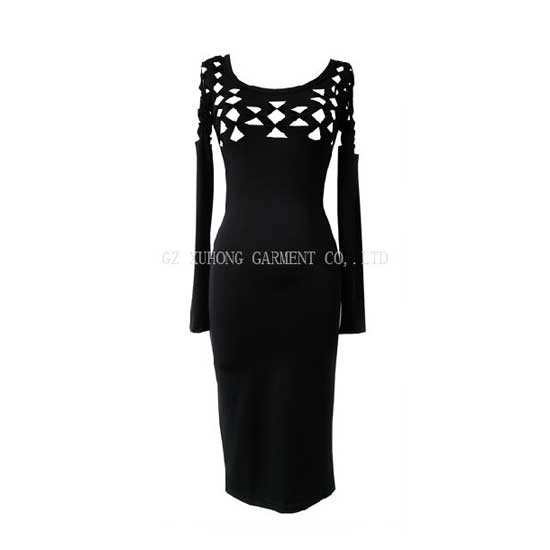 This ladies’ knitted dress snatches your attention with the cutout holes at the front top. The well-tailored bodice shows your alluring feminine figure easily. This black-toned knitted dress goes great with high heels.