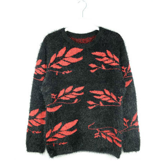 This ladies' jumper is finely knitted with monkey yarn for incredible softness and warmth. The black jumper is decorated with red leaf patterns for a touch of stylishness. The loose-fit jumper pairs well with jeans and leggings.