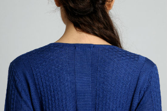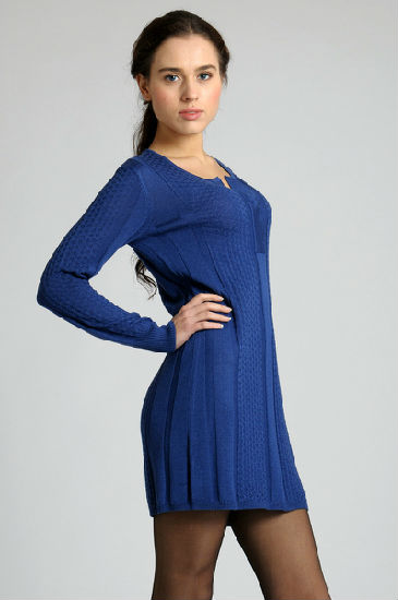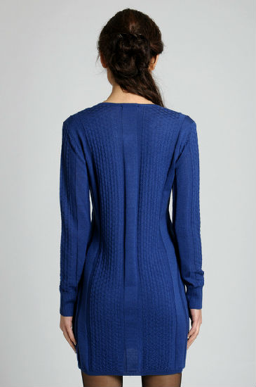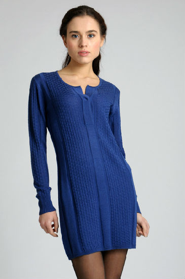 This ladies’ long dress comes in captivating blue with a raised lattice knitting pattern. It comes with a round neck and long sleeves with ribbed cuffs. Made of 70% acrylic and 30% wool, this gorgeous knitted dress promises optimum wearing comfort.