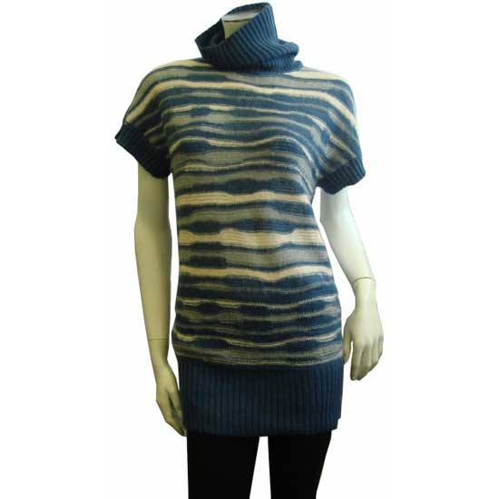 The ladies' knitted pullover bestows a bottleneck design with short sleeves. The ribbed cuffs and hem offer a flattering fit. With classy and artistic stripped patterns, this knitted pullover makes a chic addition to your fashion wardrobe.