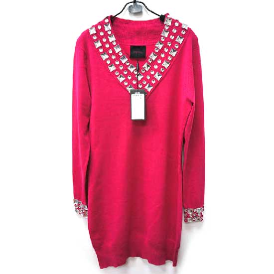 This is a ladies' knitted pullover designed in allover bright pink. Its V neckline and cuffs are masterly decorated with assorted sparkling elements for a trendy and attractive look. This stylish pullover is an ideal choice for chic ladies.