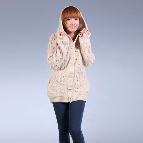 This adorable cardigan spotlights small knitted balls and intricate crochet patterns. Woven from wool and acrylic, the cardigan offers added warmth and comfort. The functional cardigan is completed with a hood and toggle front closures.