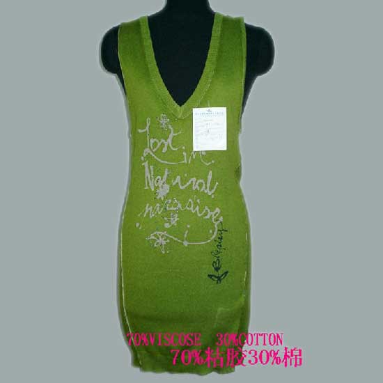 This is ladies' knitted sweater vest that is made of 70% viscose and 30% cotton. This stylish knitwear features a classic deep V-neckline and is highlighted with a sleeveless and mid-length design. The beautiful printed letters on the front add some interest to its appearance.