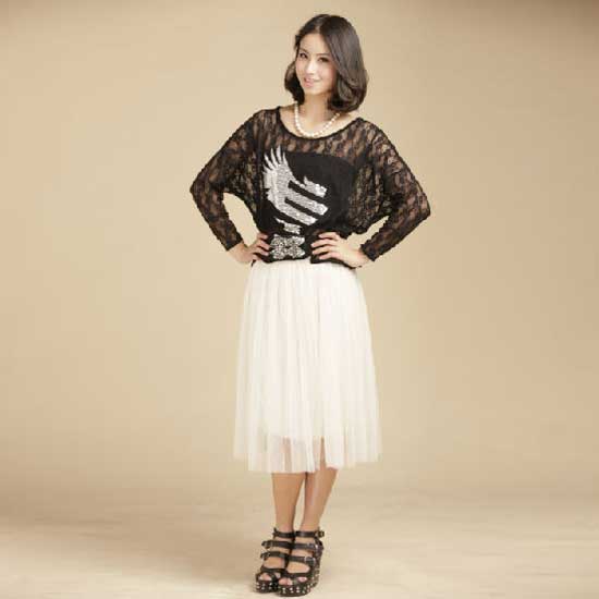 This ladies' blouse features a fashionable lace design for a sense of beauty. The stylish blouse features loose long sleeves and a classic round collar. The alluring embroidery on the front makes this lace blouse stand out from the rest.