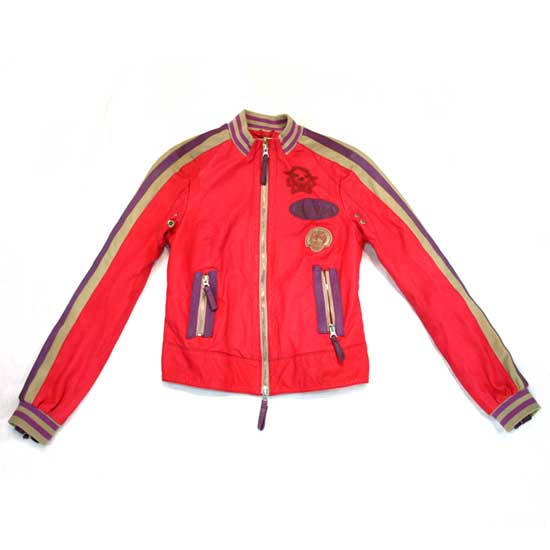 The long-sleeve jacket bestows a striking red finish with delicate laser-printed logos. The stripped collar, sleeves and cuffs offer a chic style. Two zipped pockets are included for storing your mobile items safely.