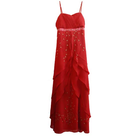 This stunning evening dress comes in an elegant red color. With spaghetti straps, the dress looks more graceful. The evening dress is characterized by the multi-layer design on the front, making it more sophisticated. Embellished with shiny beaded floral patterns, the evening dress looks beautiful. Wear this splendid dress to your party.