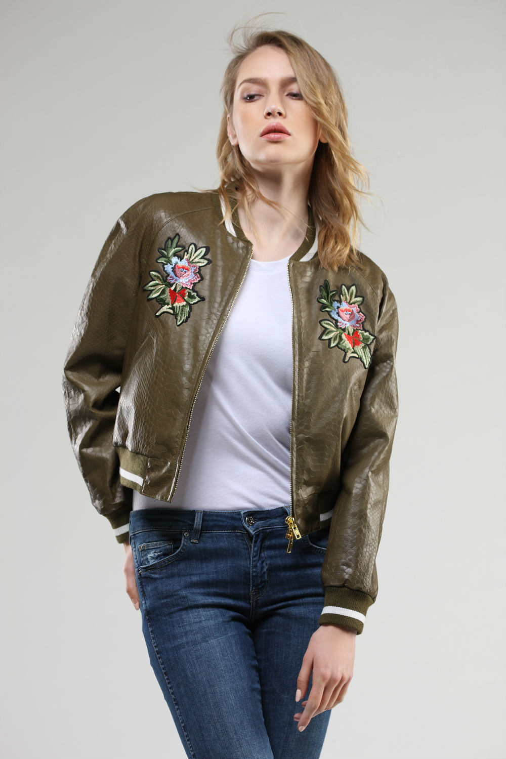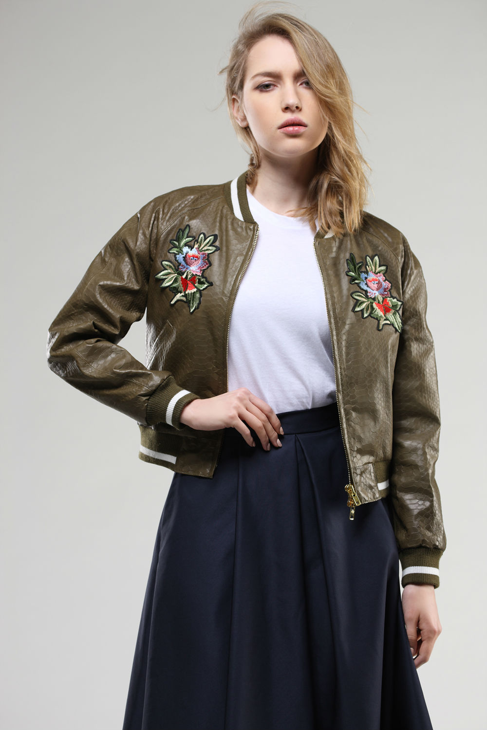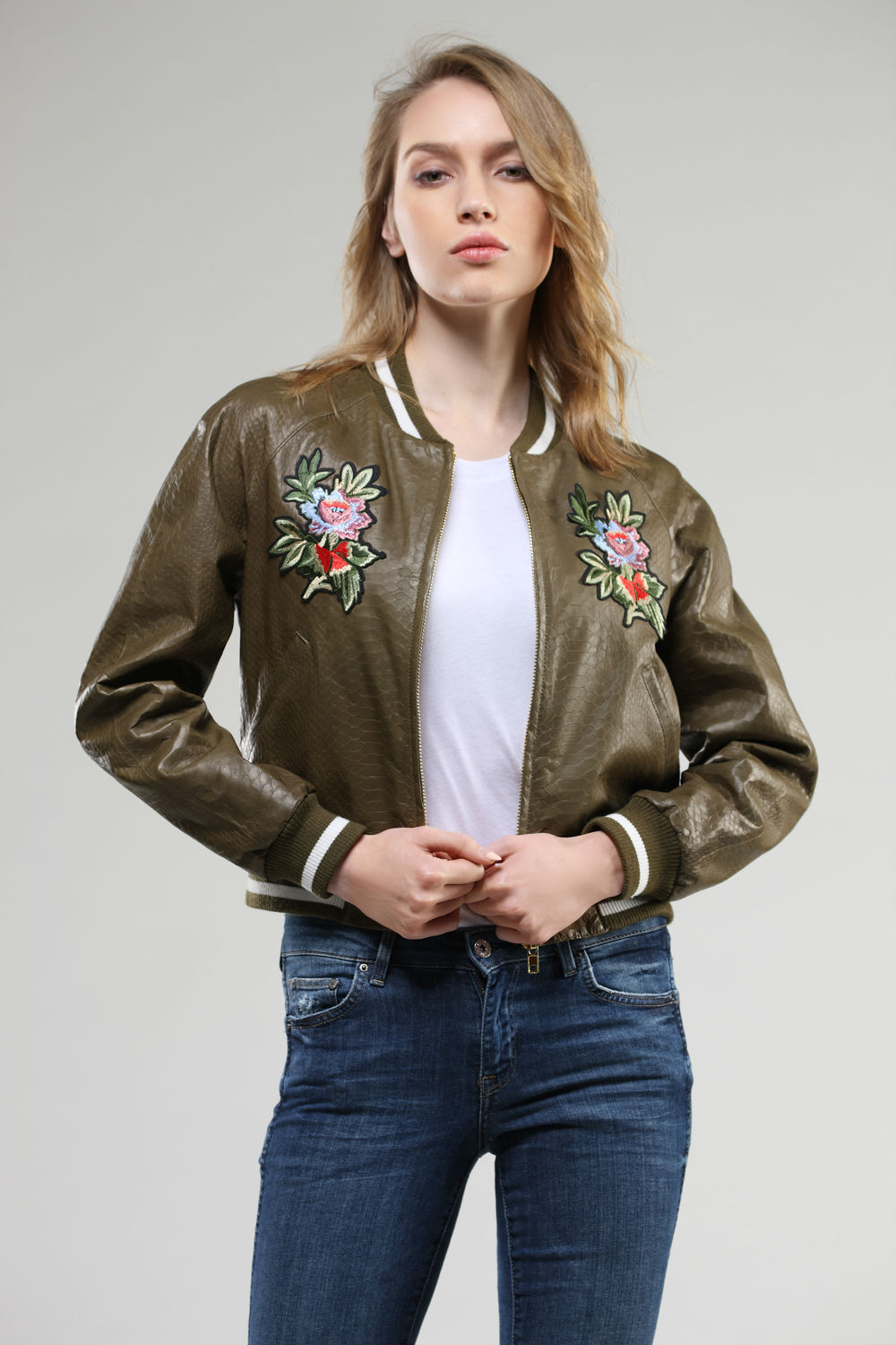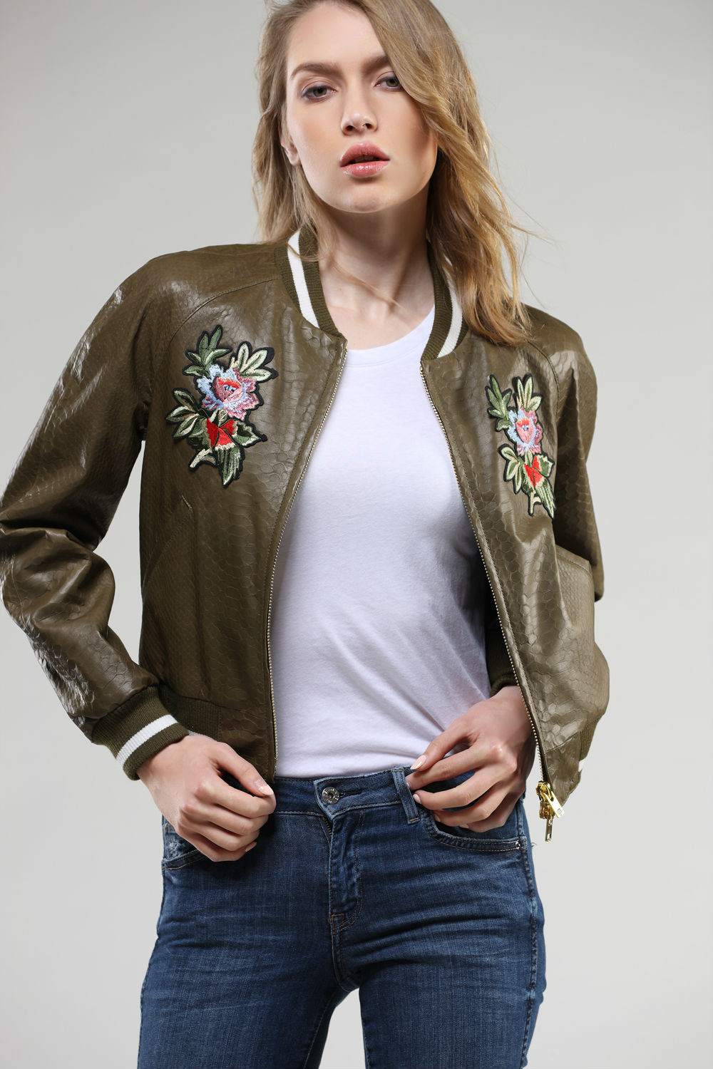 This leather bomber jacket is your edgy alternative to the usual bomber jacket. This outerwear features a gathered and ribbed neckline and matching cuffs for a laid-back and cool bomber jacket look. To spice up the casual piece, two embroidered floral patches are attached to the chest area to lend the outer a feminine and edgy vibe. Assemble this versatile jacket with a pair of skinny jeans or a midi A-line skirt for a stylish look.