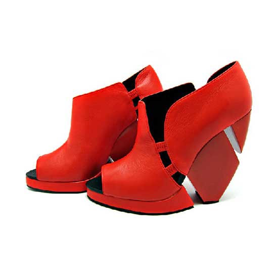 This pair of shoes attracts people's eyes with its unique and fashionable design in bright red. Each shoe features an open toe, a hollow body and a bold high heel. The high-quality leather offers enhanced comfort.