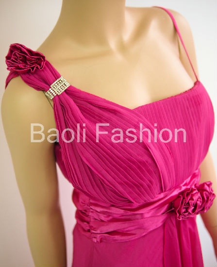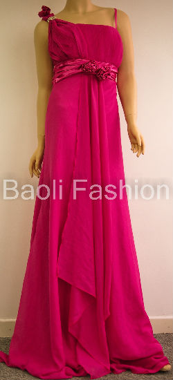 This pretty long dress is specially made for elegant ladies. The copy silk and satin dress is accented with a shinning accessory in the shoulder and rose belt for added style. This long dress complements your feminine look nicely.