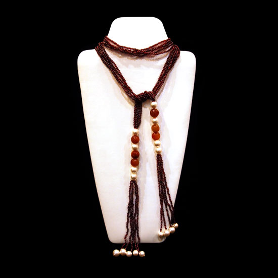 This long necklace is formed by strands of beaded necklaces accented by garnet and gold embellishments, wrapping around the neck above the collarbones and draping to hit the waistline. The necklace can be tied in a knot for a unique, distinctive style. Bringing up a tribal, retro feel, this necklace works well with your stylish outfits.