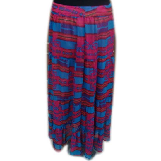 The ladies' skirt features an ankle-length design. The abstract patterns in bright red and blue colors add a decorative touch. This dress is an excellent summer outfit item.