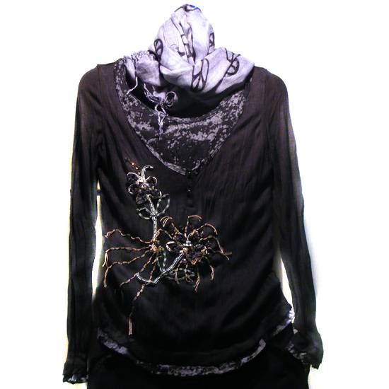This is a ladies long sleeve blouse. It is made of 50% wool and 50% acrylic. The theme colour is black and there are shiny beads composing a floral pattern which makes the blouse special.