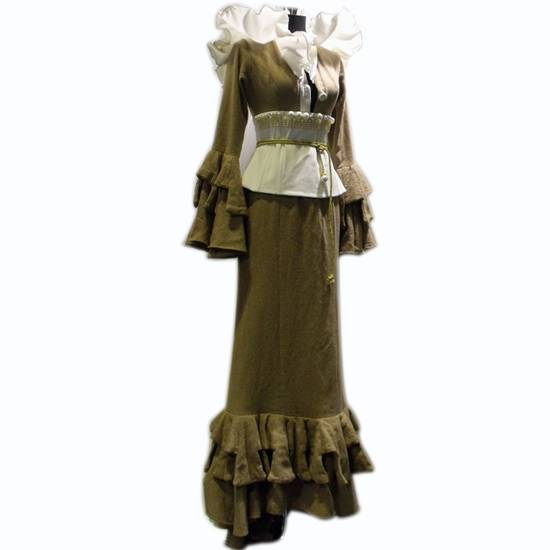 The design of this long dress flaunts a classic Western style. The layered cuffs and skirt, as well as the ruffed collar fill the dress with elegance. The handmade embroidery gives this dress a perfect finish.