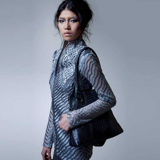 This futuristic ladies' jacket features an unconventional mandarin collar for a touch of oriental charm. Elaborate knot patterns and suede piping detail set the design apart from others. The sheer long sleeves come with velvety wavy stripes for extra feminine quality.