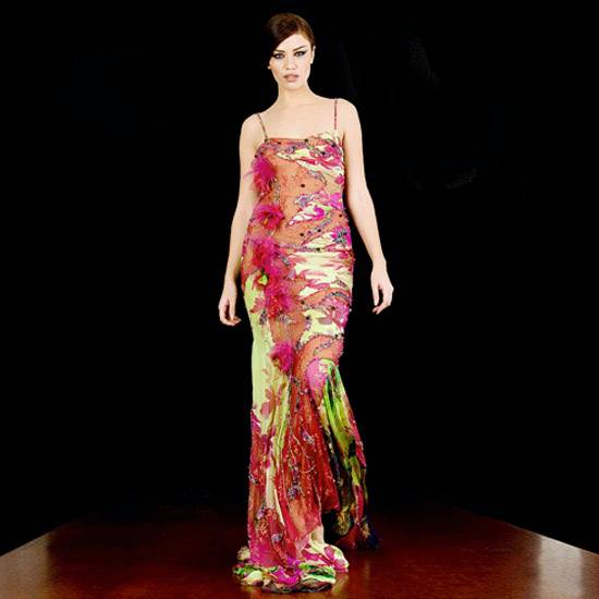This floor-length evening dress features a tube bodice and a pair of spaghetti straps. The slim cutting is perfect for showcasing an alluring female figure. The allover colorful floral patterns would definitely add a touch of glamor to your evening.