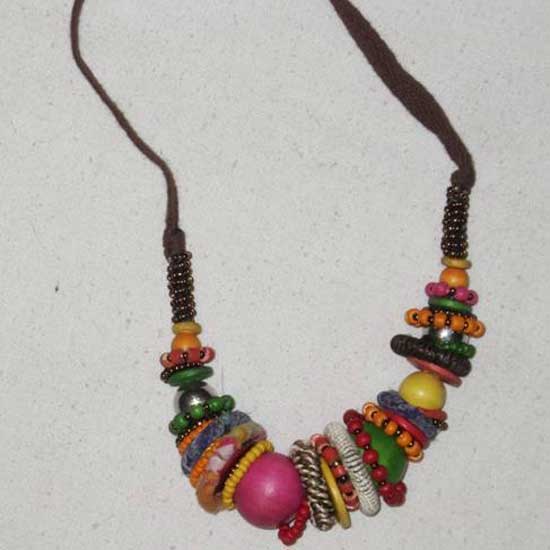 Featured here is a necklace with a design that channels ethnic fashion. The necklace catches eyes with its colorful beads made of wood and glass. The macramé-styled strap is made of cotton for comfortable wearing.