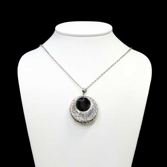 This ladies' necklace comes with a circle pendant. The pendant boasts a hollow design with a black stone embellishment for added style. The exquisite chain completes this design for a perfect finish.