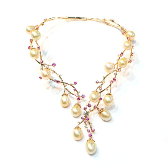 This necklace in yellow-gold comes in the shape of a branch. The Japanese Akoya pearls in a golden color nicely brighten the necklace. Finished with fancy diamond details, the necklace looks even more gorgeous and feminine.