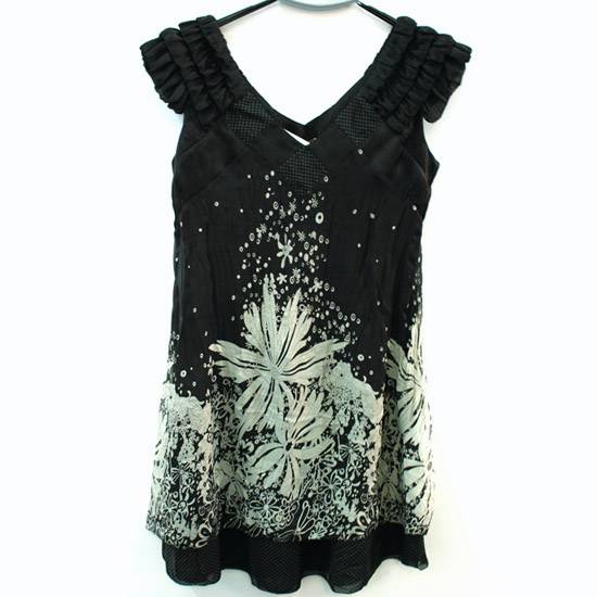 The one-piece dress features a deep V-neckline and a pair of ruffled cap sleeves. The dress comes in a black color with contrasting floral prints for a unique decorative touch. This one-piece dress makes a pretty way to enhance the fashion collection of ladies.