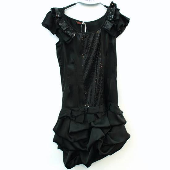 The ladies' dress features a pair of pleated cap sleeves for a touch of elegance. The dress is accented with glittering black sequins to create a sense of mysterious yet elegant glamor. This one-piece dress makes a chic piece to enhance ladies' closet.