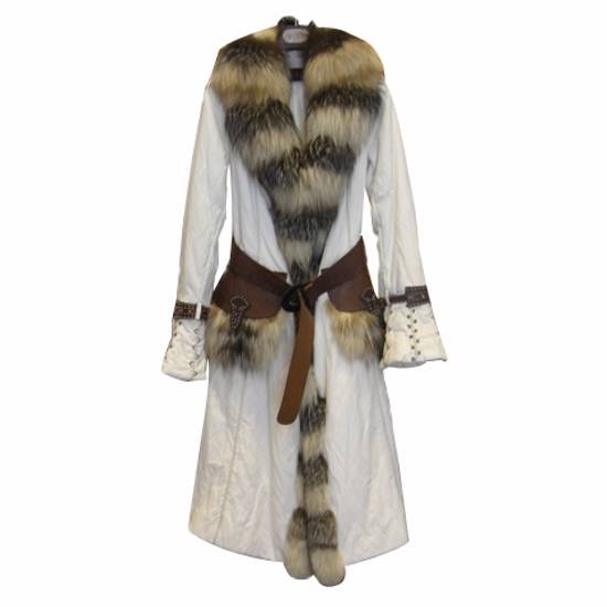 The ladies overcoat is made of high quality metallic fabric. The dress features a silver fox trimming to make it elegant. It is perfect for high-end shoppers.