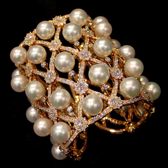 The featured bangle flaunts 34 pieces of luminous pearls in between meshed band. The meshed band features shimmering diamonds for added elegance. The extravagant bangle boosts the glamor of a woman in banquets.