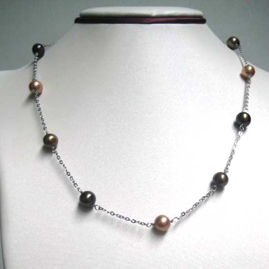 This classy pearl necklace features a silvery chain with pearls arranged sparsely on it. The dark-colored pearls give out a sophisticated touch. Showcasing the mastery skills in cutting and polishing, the pearls come with smooth and shiny surfaces. Spice up your jewelry collection with this exquisite necklace.