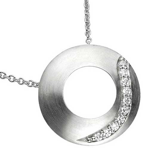 Shown here is a ladies' pendant with a ring-shaped design. It is styled with a band of glittery decorations that look eye-catching. The ring also features a sleek and lustrous surface.