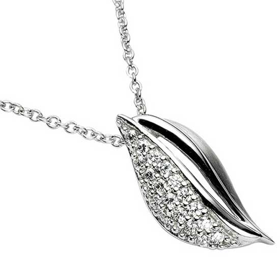 As shown is a ladies' pendant featuring an artistic shape. It is embedded with dazzling trimmings in an abundant amount. This pendant is suitable for wearers pursuing elegance and uniqueness.