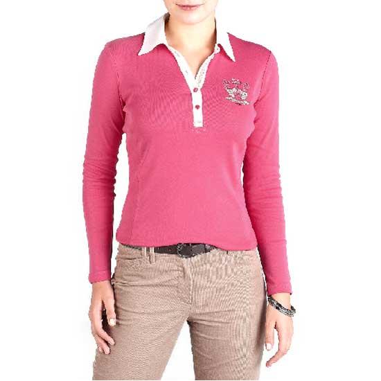 This is a ladies' polo shirt in bright pink with a white collar. It is made of high-quality cotton for a soft texture. This T-shirt is a brilliant choice for your weekend outfits.