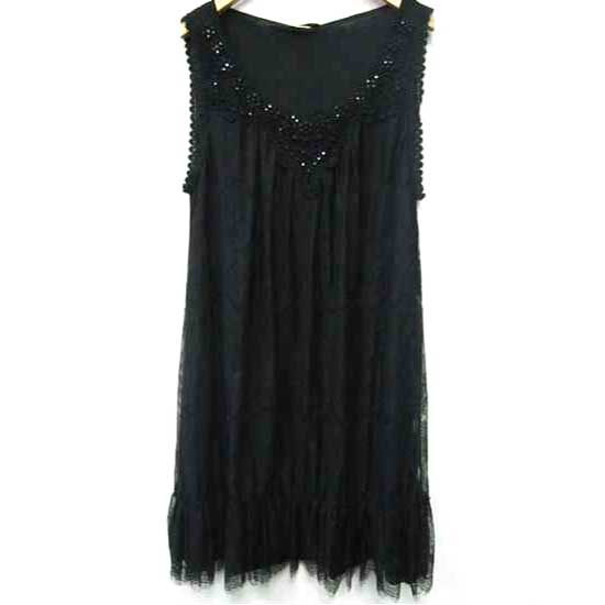 This fashionable ladies' dress features a scoop neckline and a sleeveless design. The dress is beaded with shimmering black stones around the collar and armholes. The black lace outer layer adds a feminine and elegant touch to the dress.