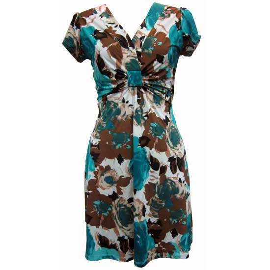 This trendy ladies' polyester dress spotlights bold, vivid floral prints throughout the entire piece. The dress is designed with a gathering empire waist to produce a figure-flattering effect. The dress is completed with a V-neckline and short sleeves.