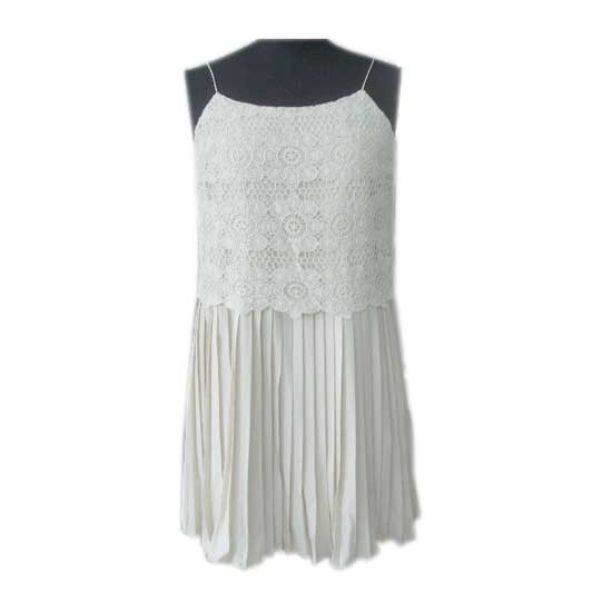 This is a ladies' dress boasting an elegant and beautiful design in allover white. It features a lace top with a pair of spaghetti straps and a pleated bottom. With exquisite details, this stylish lace dress is an ideal choice for chic ladies.