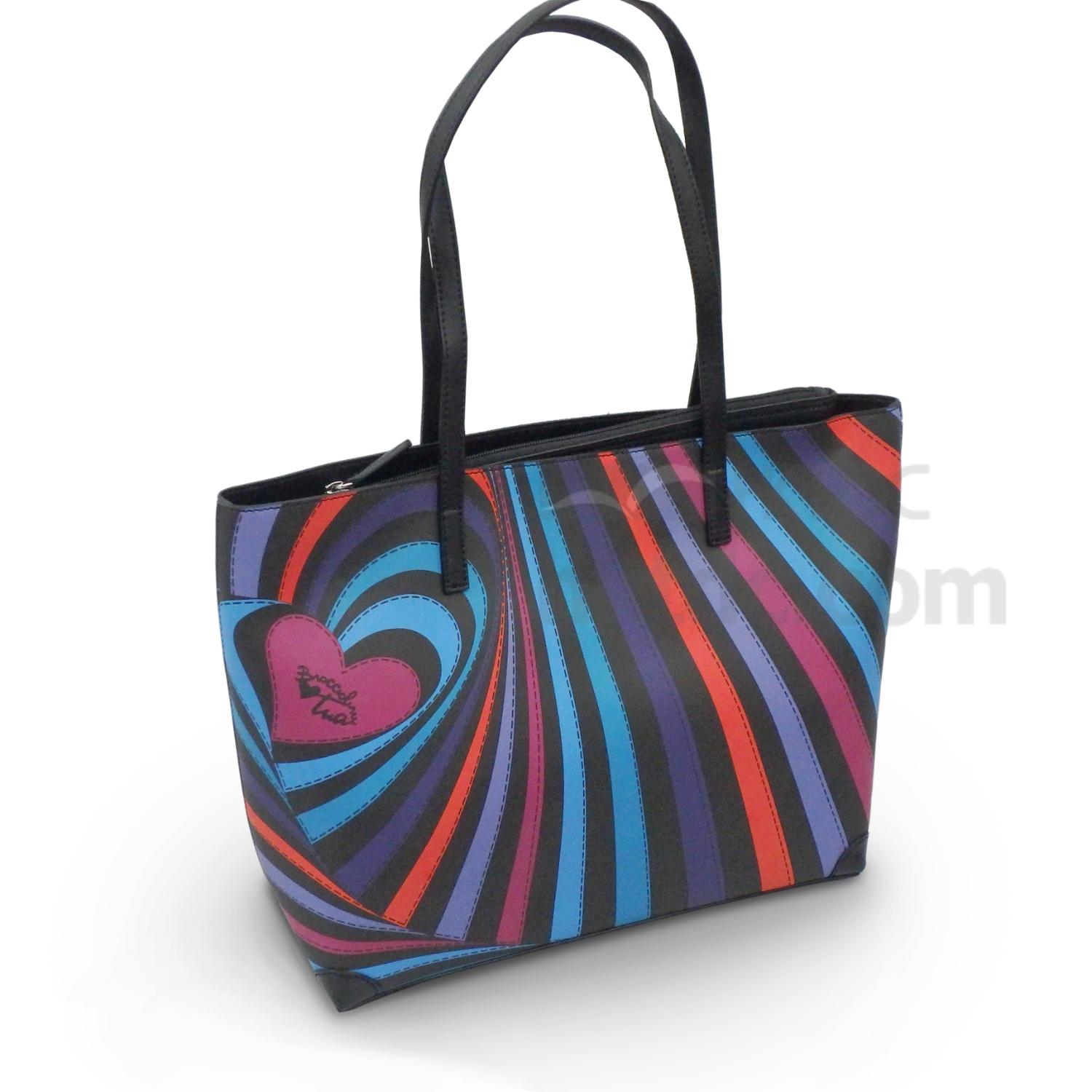Surprise your bestie by getting her this adorable and vibrant tote. Starting with a heart-shaped print on the side of the tote, it gradually evolves into curved lines surrounding the heart-shaped piece and then turned into slightly slanted strips in an array of colors for a sweet and colorful look. Matched with its lovely and unique design are long and slim dark-colored shoulder straps, so she can carry it on her shoulder effortlessly. Bring a sweet smile on your friend’s face by gifting her this well-designed tote.