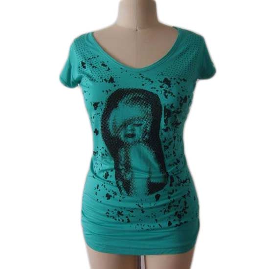 This T-shirt comes with a slim and hip-length cut for ladies. It has a wide V-neckline for a sexy look. The water print in black matches with the green color to look eye-catching.