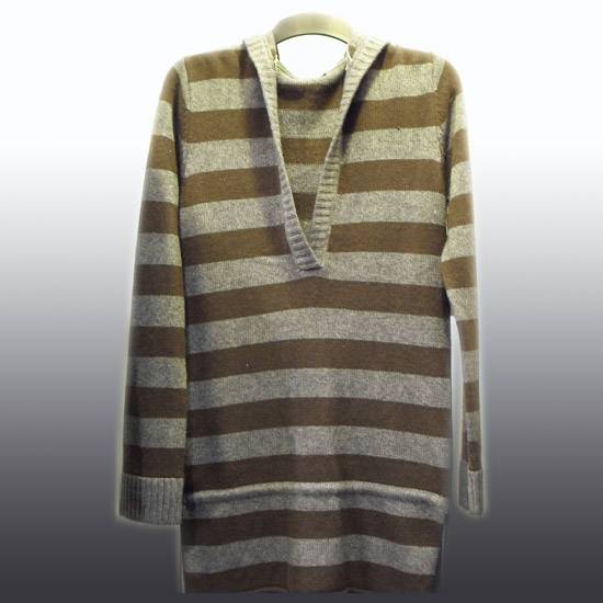 The ladies' pullover features horizontal stripes in shades of gray and brown. The deep V-neckline and self-tie wrist string offer added style. This pullover is a stylish addition to your wardrobe.