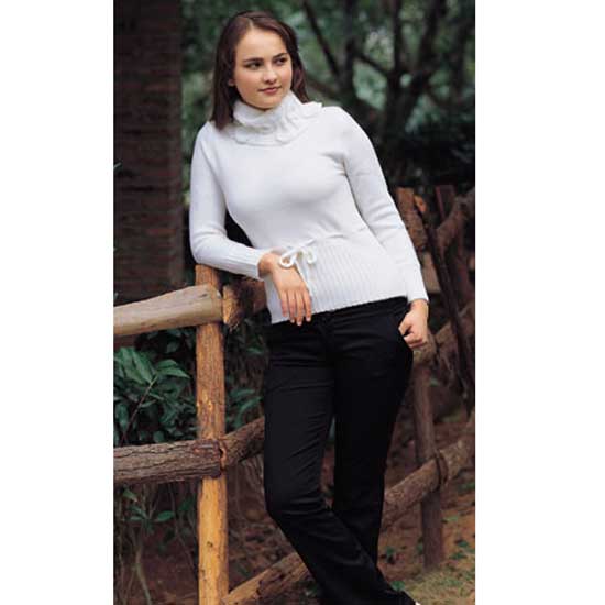 This ladies' pullover features a turtleneck with leafy adornments. The waist boasts a drawstring design, coming with the trimmed cuffs and bottom for a flattering fit. The lightweight and breezy fabric simply makes this pullover relaxing to put on.
