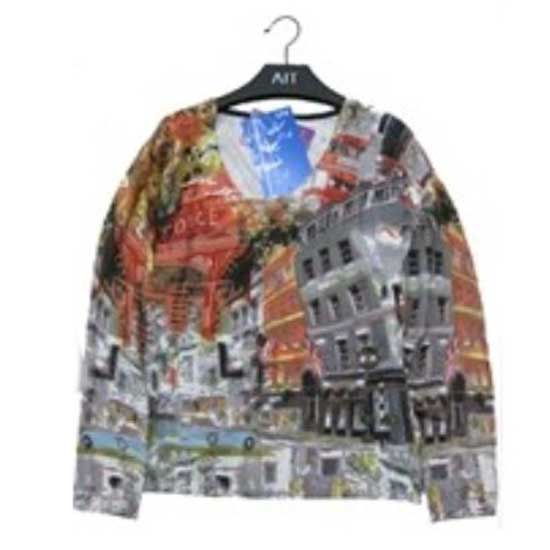 This ladies' pullover arrests attention with its beautiful allover street scene. The pattern is completed and enlivened with precise colors. The loose cut also makes this pullover comfortable to wear.
