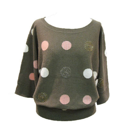 This is a ladies' pullover designed in dark brown. It is highlighted with white and pink dots and shimmering beads. This elegant pullover goes well with assorted trousers for a chic look.