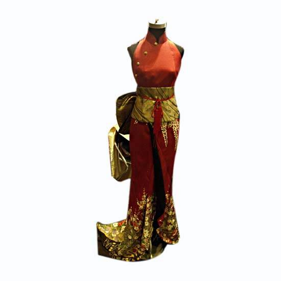 This ladies' dress combines traditional Chinese and Japanese dress styles. It features a Chinese qi pao and is secured by a Japanese obi. The unique dress makes a distinctive item to be added to your wardrobe.