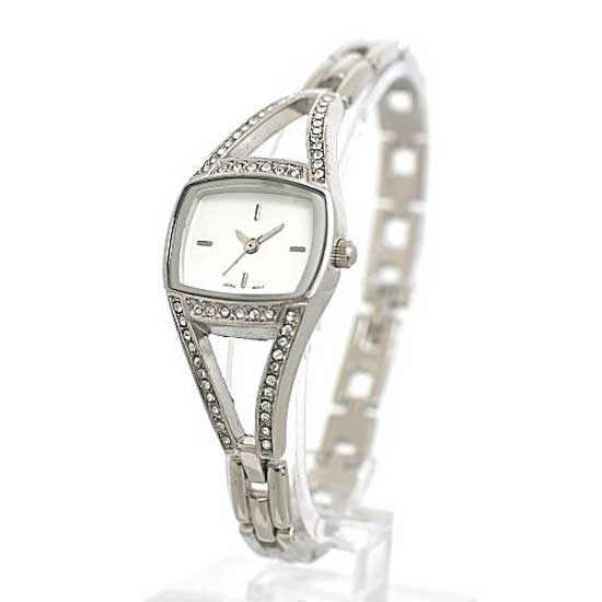 This quartz analog watch comes with slim straps made of brushed alloy. It is paved with shimmering CZ stones for an elegant touch. The simple-design white dial radiates glamor. Present this exquisite watch to a graceful lady.