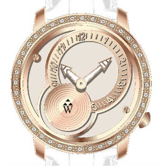 This ladies’ quartz analog watch is characterized by its IP rose gold-plated case with setting stones or diamonds on the bezel. The round dial is ingeniously crafted with two sub-dials and pointed hands, conveying a sense of playfulness. The exquisite timepiece is finished with a bright white leather strap for extra glamor.